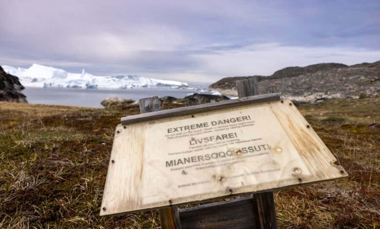 A warning sign in Greenland about tsunamis caused by icebergs