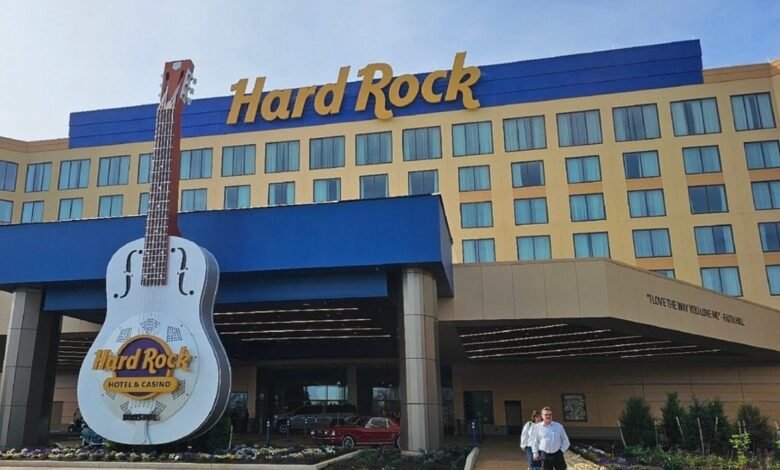 The permanent facility features a 45-foot-tall guitar outside the resort’s main entrance. Inside, guests find 303 hotel rooms, numerous restaurants and bars, and a casino floor with 1,500 slot machines, 50 live dealer table games, and a Hard Rock Bet Sportsbook.