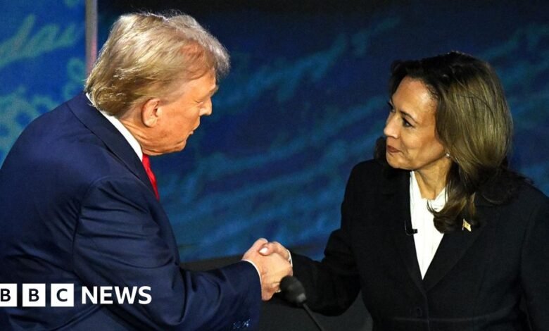 AFP Donald Trump and Kamala Harris shake hands while smiling courteously at each other, both wearing suits, against a blue backdrop on stage in Philadelphia in SeptemberAFP