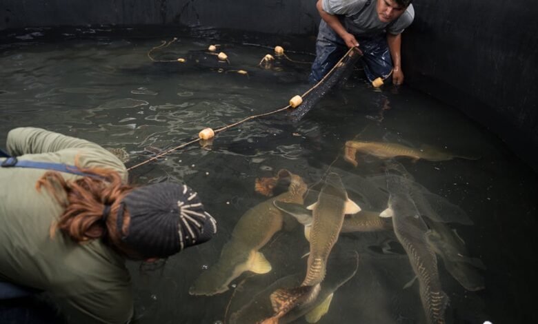 Farmers carry a paiche from one of the ponds where it’s sustainably raised.