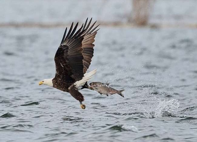 Photo of banded bald eagle capturing a fish by Michael Harriff (provided by DEC).