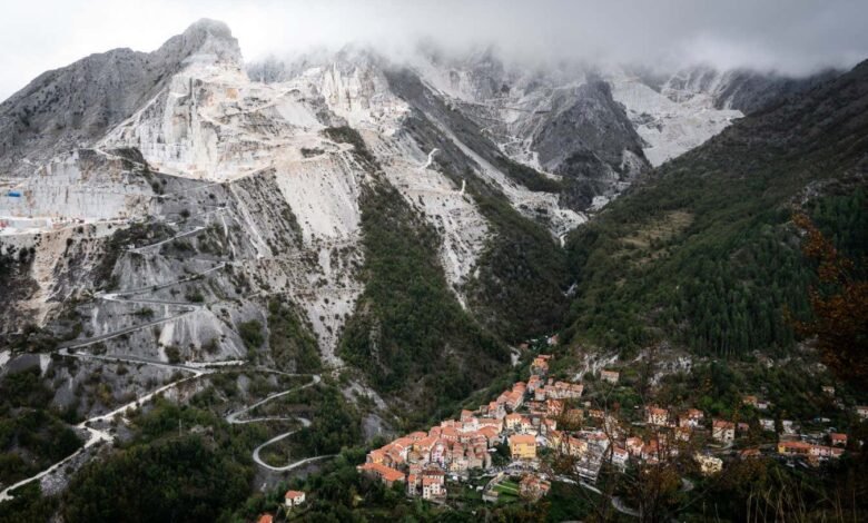 At the foot of striking marble quarries in central Italy’s Apuan Alps sits the village of Colonnata (pictured above) – a quaint place famed for its pork lard and quarry workers. The stone extracted from outside the nearby city of Carrara, including from the white marble quarry in the image below, is widely regarded as the purest and most valuable in the world.
