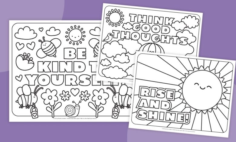 The bundle includes five thoughtfully designed pages, each with an uplifting phrase like “Think good thoughts” and “Be kind to yourself.” They’re fun, easy to use, and packed with good vibes. These pages encourage self-love, empathy, and creativity, providing children with positive messages to reflect on as they color.