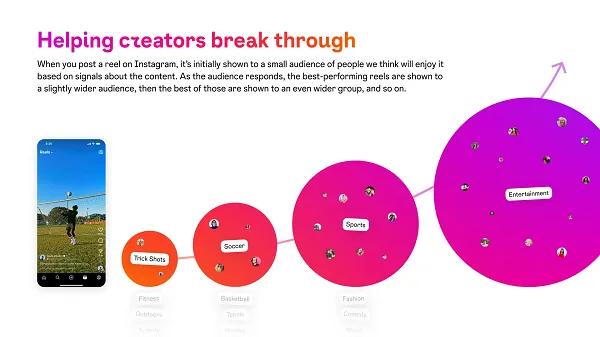 “When you post a reel on Instagram, it’s shown to both followers and non-followers. Among non-followers, your reel is initially recommended and shown to a small audience of people that we think will enjoy it. As this initial audience responds to these reels, the best-performing reels are then shown to a slightly wider audience, then the best of those are shown to an even wider group and so on. This process is designed to level the playing field by distributing content based on its engagement, not just the creator’s follower count.”