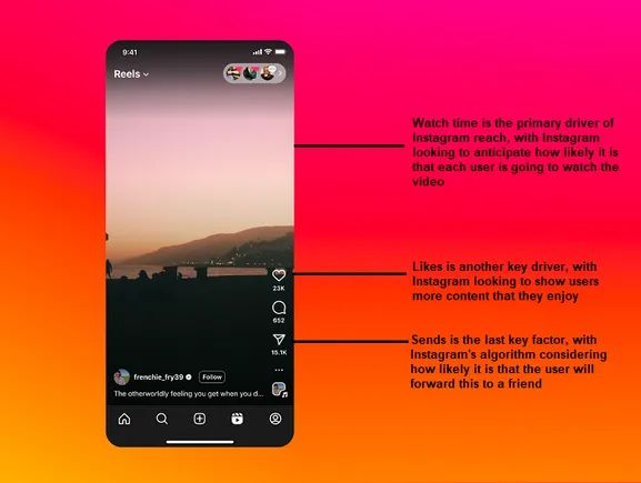 “The top three signals that matter most for ranking are watch time, likes and sends. So when looking at your insights, pay close attention to average watch time, likes per reach, and sends per reach.”