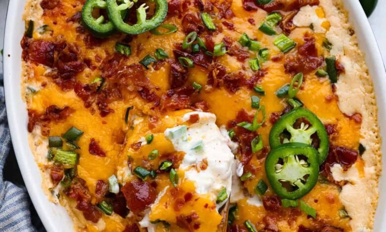 - Assemble: Spread the mixture into the prepared baking dish, then sprinkle the top it with the cheddar cheese, ½ cup bacon, and ½ cup jalapeños.
