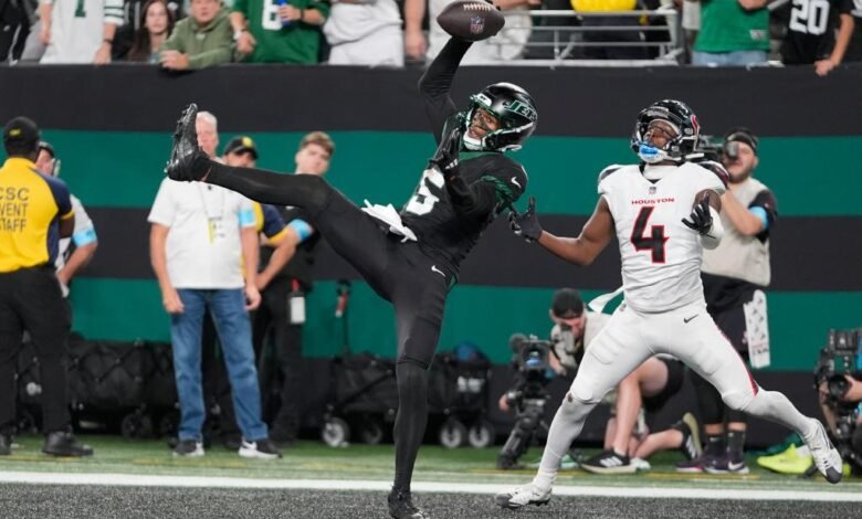 Garrett Wilson makes an incredible touchdown catch in the fourth quarter of the Jets-Texans game. AP