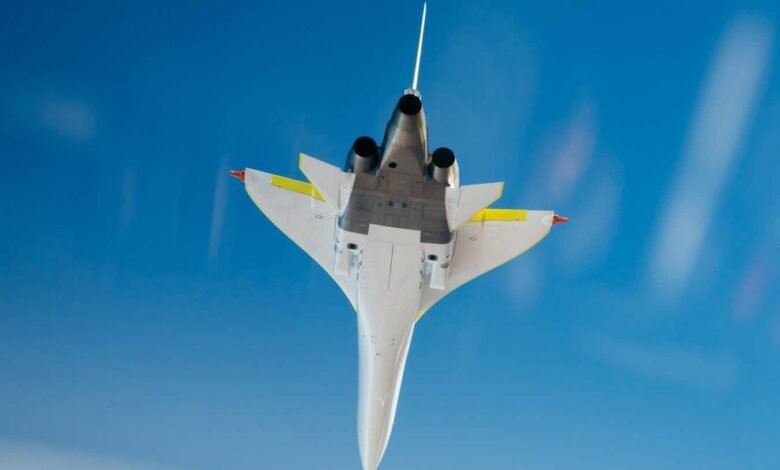 The XB-1 prototype plane in flight, with shark skin material patches stuck on its belly