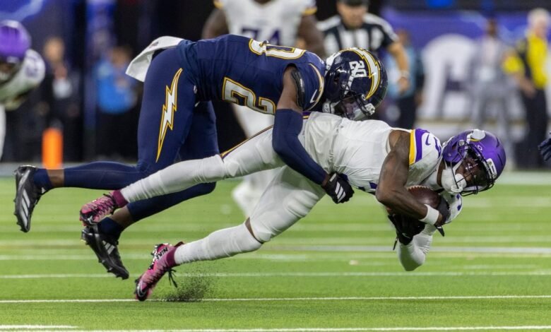 Minnesota Vikings WR Jordan Addison is tackled by Los Angeles Chargers CB Cam Hart during a game in Inglewood, Calif., on Oct. 23, 2025. Addison’s trespassing charge at a Seminole Hard Rock Casino in Florida has been dismissed. (Image: Shutterstock)