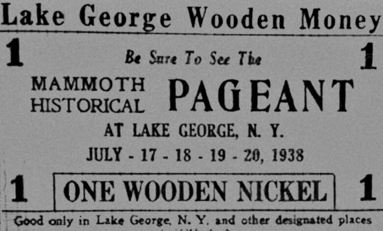 Therefore, to fund a mammoth local history pageant, the event’s organizers came up with a novel idea. They printed wooden nickels called “Lake George Wooden Money” and the best thing about the fake coinage was that it worked.
