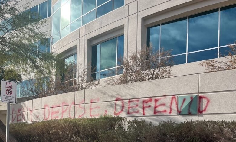 The UnitedHealthcare office complex in Las Vegas was recently vandalized, with graffiti reading, “DENY, DEPOSE, DEFEND.”