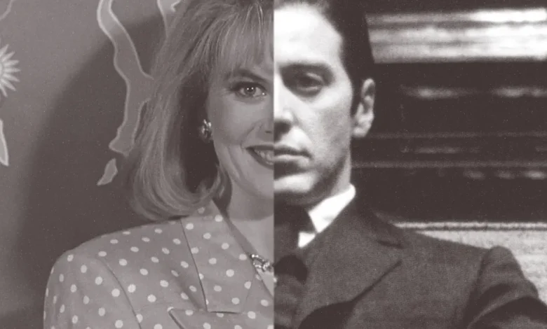 Only Larry’s sister, Janice (Illeana Douglas), sees through this delicate façade, calling Suzanne “an ice queen” and “a four letter word: C‑O-L‑D, cold.” Where Michael Corleone’s signature coldness is presented as an extension of the American capitalist imperative, Suzanne’s status as an “ice queen” is presented as a monstrous extension of that all-American medium of “New World” modernity, television. In this sense, Suzanne’s relative “coldness” is her defining characteristic and the principle that unifies the film’s themes – as Marshall McLuhan suggests, television is a cool medium, mesmeric and passifying, and, icy though she may be, it’s her “avidity,” her passionate desire to make it (her failure to truly embody Michael’s businesslike “New World” mentality) that fails her. “She looks very fragile and delicate right?” Larry tells Janice when they start dating, “But when we’re– when I’m… the details are too graphic, but she’s like a volcano.”