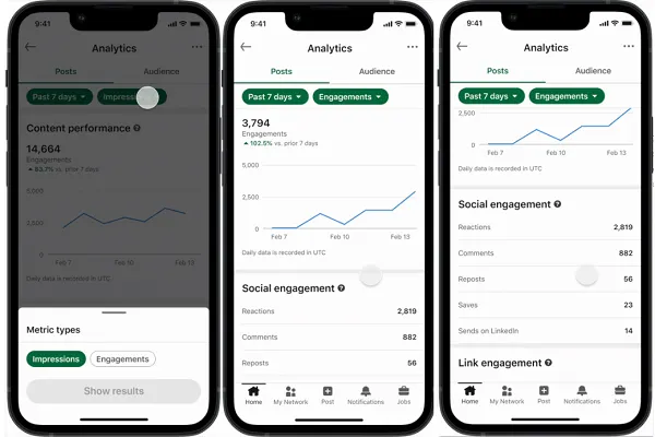 As you can see in these example screens, now, within your “Engagements” data, you’ll see both “Saves” and “Sends on LinkedIn” within your “Social engagement” tracking.