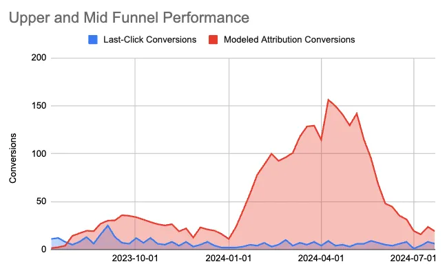 “As an example, the business [in testing] observed the performance of both models for Upper and Mid Funnel campaigns which are found in Video Ads, Digital Display and Social Media. When comparing both models for non-search channels, Modeled Attribution was able to recognize and deliver credit whereas Last Click remained flat. This is due to the model’s ability to stitch impressions from these campaigns in the user journey which RBA models are not able to do. Initial results show a 150x increase in credit found in Modeled Attribution which paces well with Marketing’s spending increase during this time frame.”