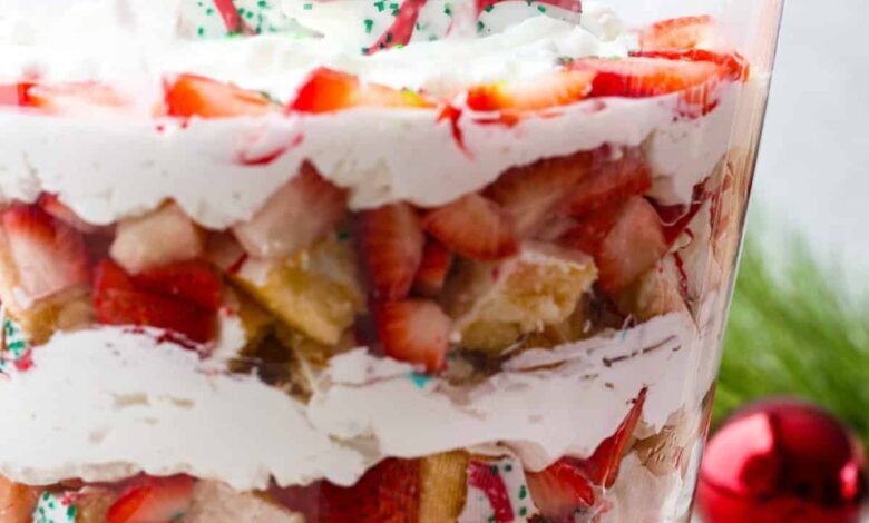Little Debbie Christmas tree trifle is super adorable and tastes amazing! It’s filled with sweet strawberries, creamy cream cheese, whipped topping flavored fluff, and chunks of the iconic Little Debbie Christmas trees.