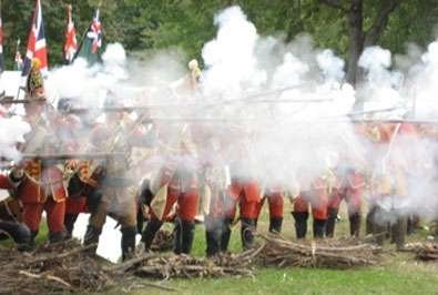 Photo: Troops firing muskets during a Battle of Lake George reenactment (courtesy French and Indian War Society).