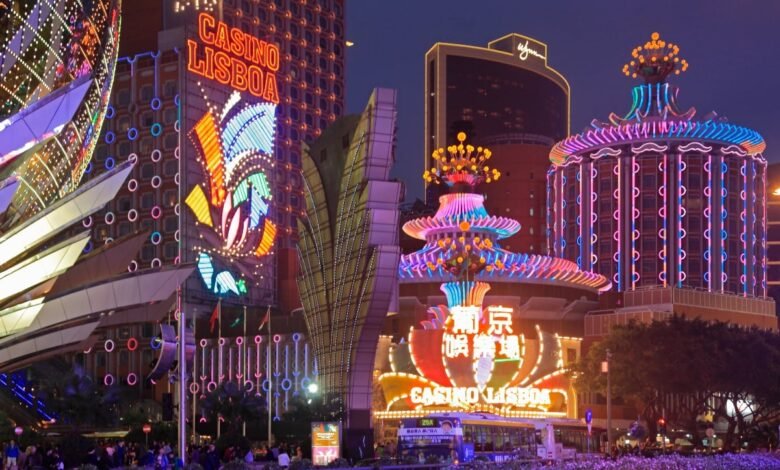 SJM Resorts’ Casino Lisboa is pictured in downtown Macau with Wynn Macau in the background. Casino employees at five of the six Macau casino companies have been confirmed for annual bonuses equal to one month’s pay. Sands is expected to join the handful in announcing bonuses this week. (Image: Getty)
