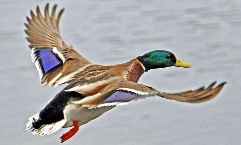 Photo of a drake (male) mallard duck in flight in Bridgewater, Nova Scotia, by Wikimedia user Dennis G. Jarvis.