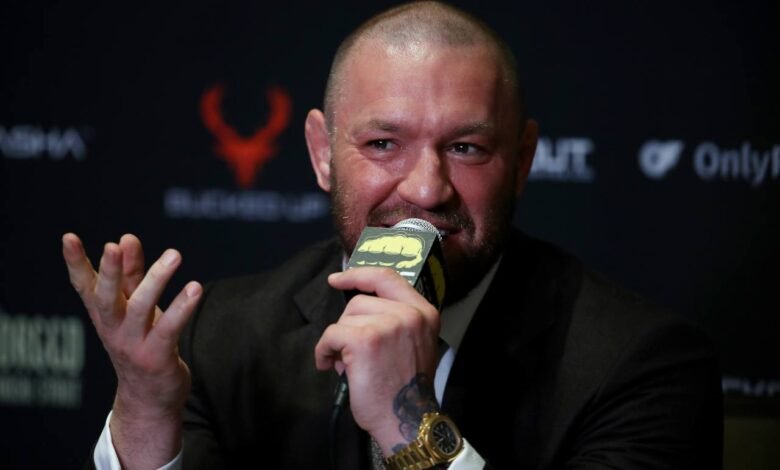 Conor McGregor interacts with media after BKFC 70 Hollywood at Hard Rock Live in Seminole Hard Rock Hotel & Casino in March in Florida. McGregor says he is looking for $100 million to take part in next summer’s White House UFC event. Photo by Leonardo Fernandez/Getty Images.