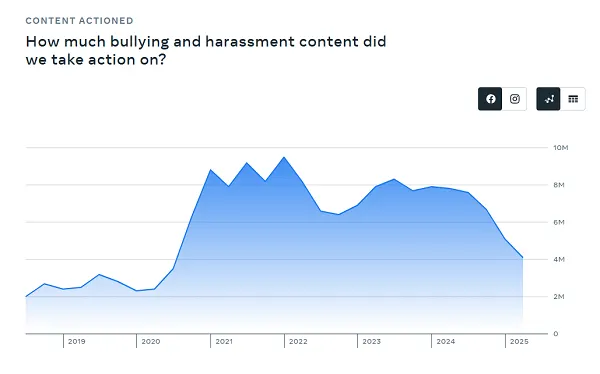 One key measure here would be “Bullying and Harassment,” and the rates at which Meta is enforcing such under these revised policies.