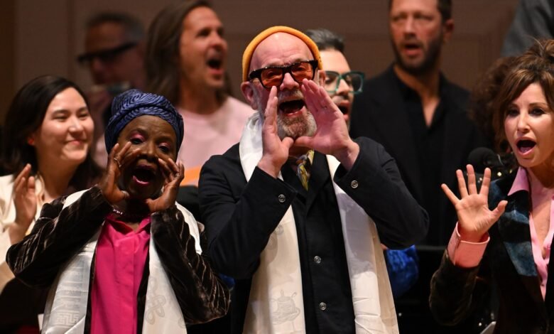 Other highlights included Peck’s sparse take on the Leonard Cohen classic “Chelsea Hotel #2,” Jackson Browne’s acoustic rendition of his 2002 song “Don’t You Want to Be There,” and Laurie Anderson playing violin to a haunting recording of Lou Reed vocals taken from his 2011 song “Junior Dad.” Near the end of the night, Beninese-French singer Angélique Kidjo brought everyone in Carnegie Hall to their feet for the joyous “Afrika.” Gogol Bordello closed out the main set with wild versions of “Solidarity” and “We Mean It, Man.”