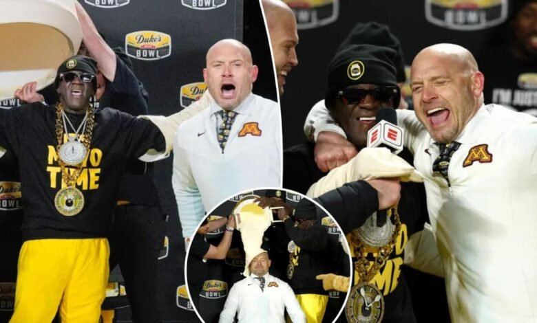 Minnesota’s P.J. Fleck gets mayo bath from guest mascot Flavor Flav