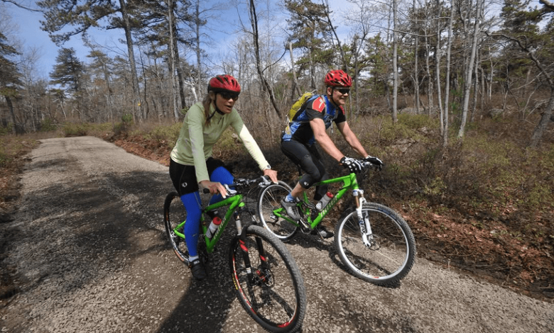 Illustrations, from above: Bicyclists on Lake Awosting Carriage Road (John Rozell photo provided by State Parks); and a map of the Lake Awosting Carriage Road (provided by Open Space Institute).