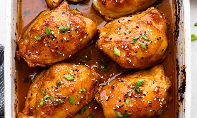 1. Prep: Preheat an oven to 400 degrees Fahrenheit, then spray a 9x13x2 inch baking dish with cooking spray. Wipe the chicken thighs dry with a paper towel.