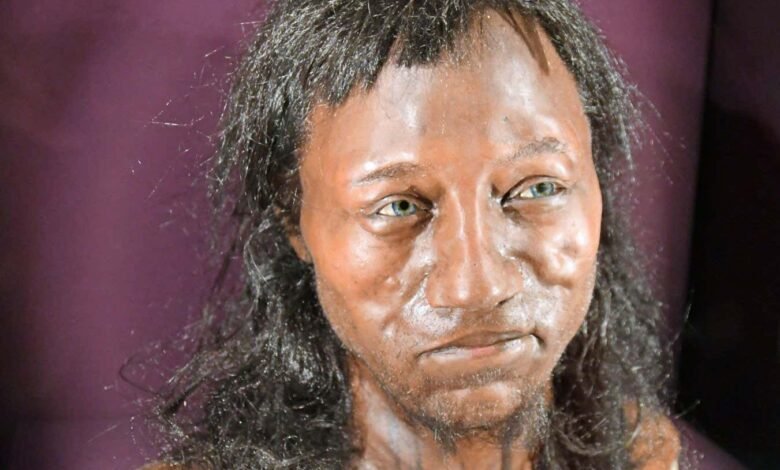 A model of Cheddar Man, a person who lived in Britain 10,000 years ago, based on analysis of his DNA