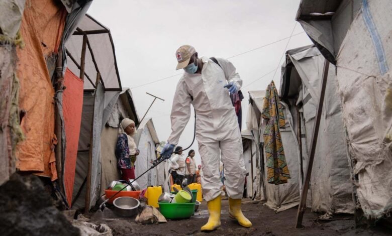 A Red Cross worker spraying chlorine-based disinfectant in Goma in the Democratic Republic of the Congo in August 2024