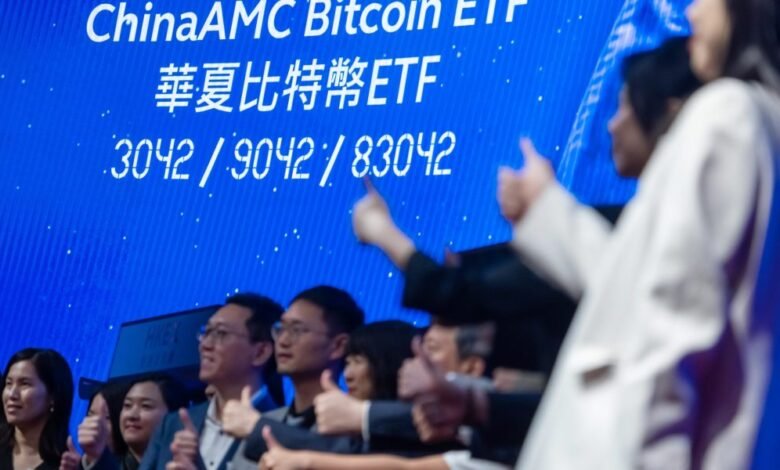 Signage during the listing ceremony of a spot-Bitcoin ETF issued by China Asset Management at the Hong Kong Stock Exchange in Hong Kong, China, on Tuesday, April 30, 2024. A batch of exchange-traded funds investing directly in crypto debuted in Hong Kong, heralding potential competition for US Bitcoin products whose popularity stoked a record rally in the digital asset.