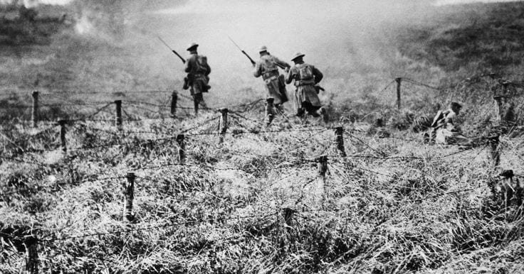 Wave after wave doggedly moved forward through the hail of singing lead and screaming shrapnel, to then crash against the German lines. As one faltered or fell back, another would take over.