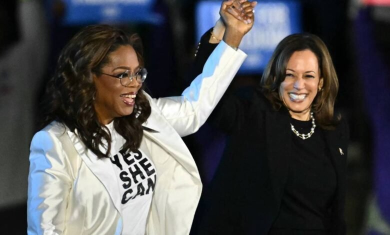 The media mogul introduced Harris as the “the next president of these United States,” as Harris walked to the podium to Beyoncé’s “Freedom,” which has soundtracked much of the Harris-Walz ticket since this summer.