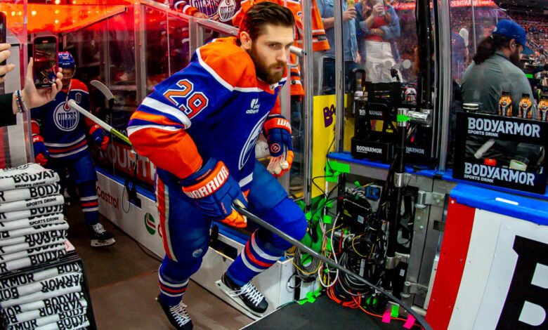 Leon Draisaitl of the Edmonton Oilers hits the ice for the pre-game warm up against the Florida Panthers in Game Five of the 2025 Stanley Cup Final at Rogers Place in Edmonton last June. Photo by Andy Devlin/NHLI via Getty Images.