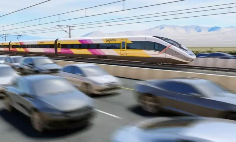 Brightline West will travel 218 miles on the median of Interstate 15 at speeds of up to 200 mph, making the trip in about two hours. (Image: Brightline West)