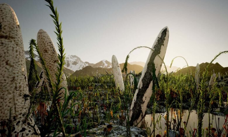 Prototaxites formed tall structures like tree trunks, shown in this illustration of a landscape from the Silurian Period