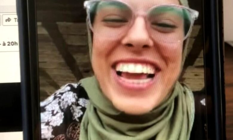 Woman laughing wearing green headscarf and glasses on a smartphone screen.