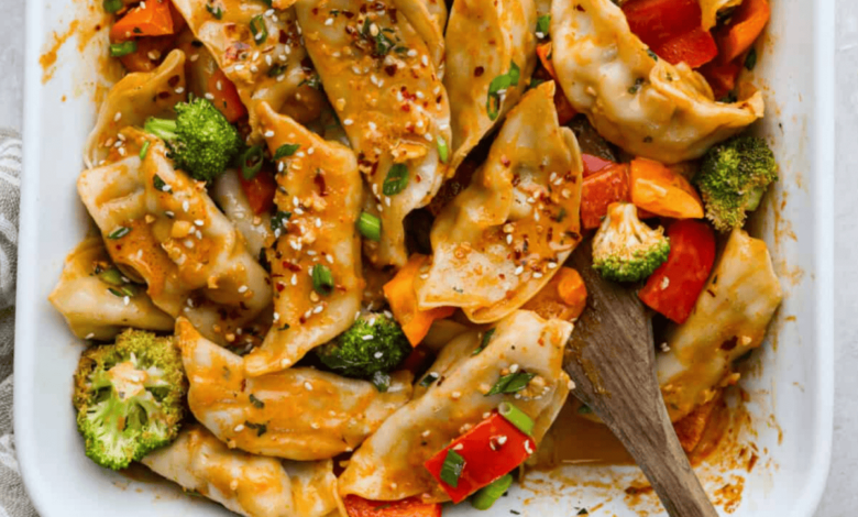 - Arrange the Potstickers and Veggies: Arrange the potstickers in an even layer at the bottom of the baking dish, then distribute your choice of veggies over the top.