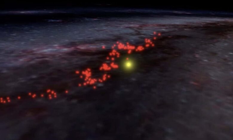 A visualisation of the Radcliffe wave, a series of dust and gas clouds (marked here in red) across the Milky Way. It is about 400 light years from our sun, marked in yellow