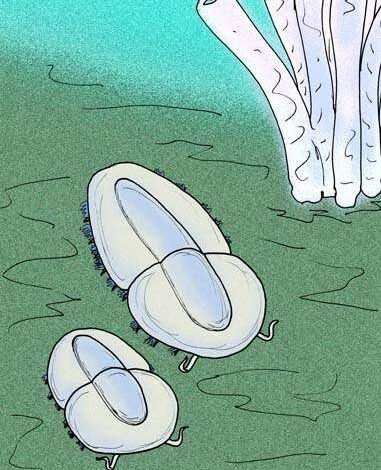 Illustrations, from above: reconstruction of a close relative Naraoia compacta (courtesy Wikipedia user