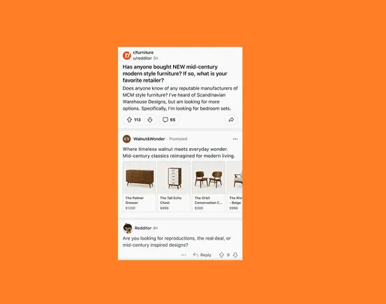 As you can see in this example, Reddit’s Dynamic Product Ads display relevant items from your product catalog alongside related subreddit conversations.