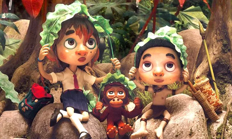 As chainsaws annihilate trees and animal chatter in the opening of Savages, Claude Barras makes clear the target of his new feature film’s title: the drivers of deforestation in the name of “civilisation”, as the title treatment drops over a plantation. While plantation worker Mutang’s additional muttering of “savages” in response to the plantation’s armed guards shooting an orangutan in cold blood feels heavy-handed, it doesn’t take away from the power of the film’s stop-motion craft. Mutang and his young daughter Keria adopt the surviving baby ape, a casualty and representative of the casual barbarity of deforestation.