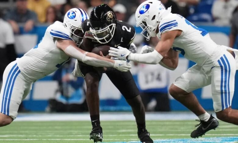 Shedeur Sanders is sandwiched by linebackers Harrison Taggert (left) and Isaiah Glasker during Colorado’s 36-14 loss to BYU in the Alamo Bowl on Dec. 28, 2024. AP
