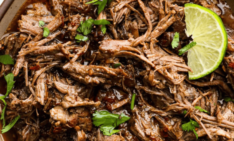 - Cook and Shred: Cover with a lid and then cook on LOW for 8-9 hours or HIGH for 6 hours. Shred the meat with two forks and serve in a tortilla. Garnish with fresh cilantro, chopped red onion, and lime wedges.