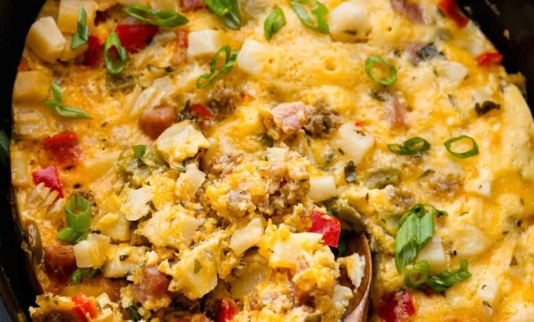 • Mix the sausage, ham, frozen hash browns, onion, bell peppers, and cheese in a large bowl.
