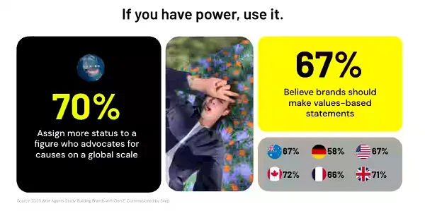 “70% of global Gen Zers say they would assign more status to a figure who advocates for causes on a global scale, while 59% would assign less status to those who display their wealth on social platforms.”
