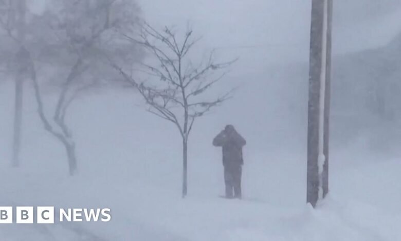 People in Syracuse, New York battled heavy wind to plow pathways through the snow, while wintry conditions were also seen in Lowville, further north.