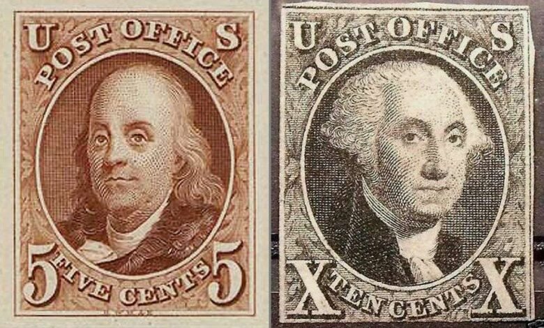 Illustrations, from above: The first US postage stamps, authorized by Congress March 3, 1847; Detail from the first national postal road map, created in 1796 by Assistant Postmaster General Abraham Bradley (see a full version here); The New York, NY, Post Office on Pine Street, Manhattan, constructed 1835; and an early postage stamp image of a train from 1869, the year the transcontinental railroad was completed (National Postal Museum).