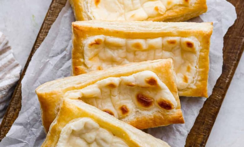 - Add the Filling: Pipe some of the sweet cream cheese filling onto the center of each puff pastry rectangle. Leave a small border of uncovered puff pastry exposed.