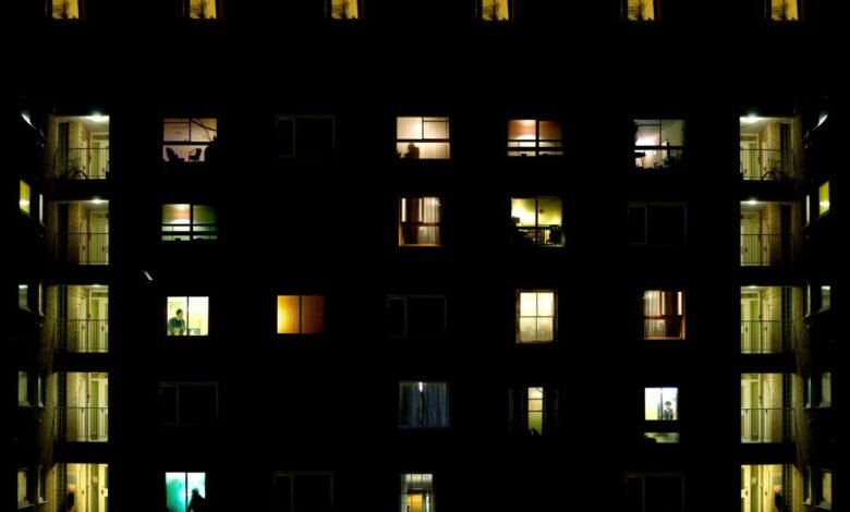 Block of flats Description Block of flats during night time with many figures in the windows and symmetrical staircase on both sides lit in green